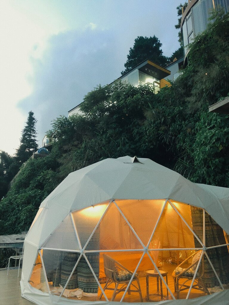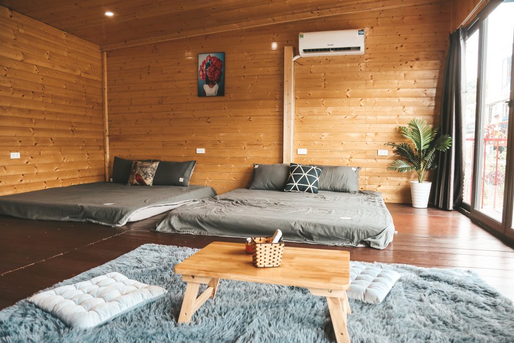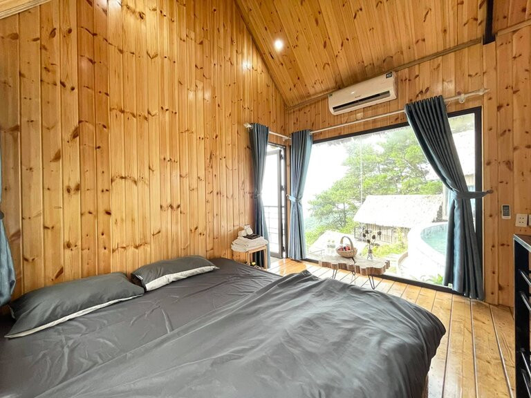Các Nhà trong phòng có 1 đệm 1m8x2m chăn, ga, gối, các đồ dung vệ sinh cá nhân, giá để đồ, minibar (nước ngọt, bia, nước lọc, đồ ăn vặt)Các nhà có hệ thống điều hòa, nhà vệ sinh khép kín, phía trước là mặt kính trong suốt nhìn xuống xóm dưới, thôn 2 Tam Đảo, thung lũng, thành phố Vĩnh Yên, có ban công ở ngoài và bàn ghế.