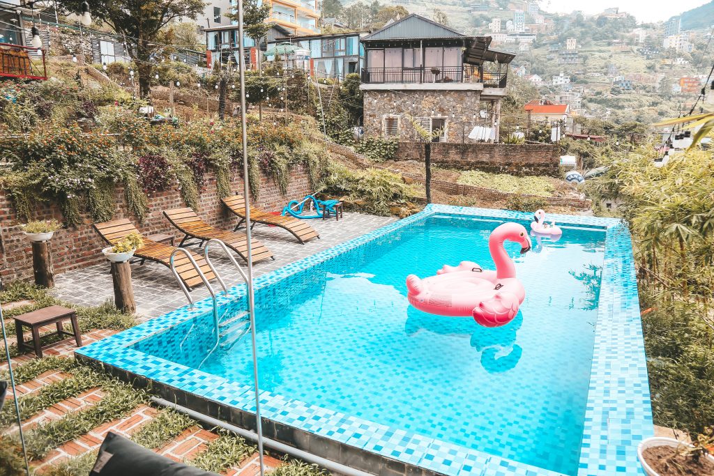 Nhà cũng có bể bơi vô cực thu hút bạn check in cực chất. Phòng ngủ không trang trí quá đặc sắc nhưng có một góc nhà thiết kế rất đặc biệt. Bạn phải chụp lại góc này vì nó rất đẹp đó! Nhà Up là căn nhà 3 tầng có 3 phòng ngủ, 1 phòng 1 giường đôi, 2 phòng 2 giường đôi.