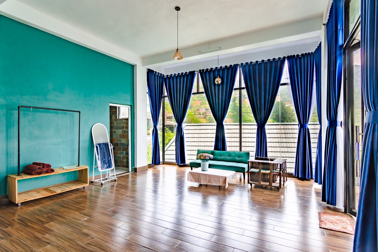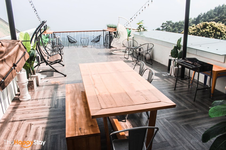 Bên ngoài cửa kính lớn là sân hiên view rộng để bạn có thể ngắm Tam Đảo yên bình mỗi sớm mai và Tam Đảo lãng mạn mỗi khi hoàng hôn buông xuống.