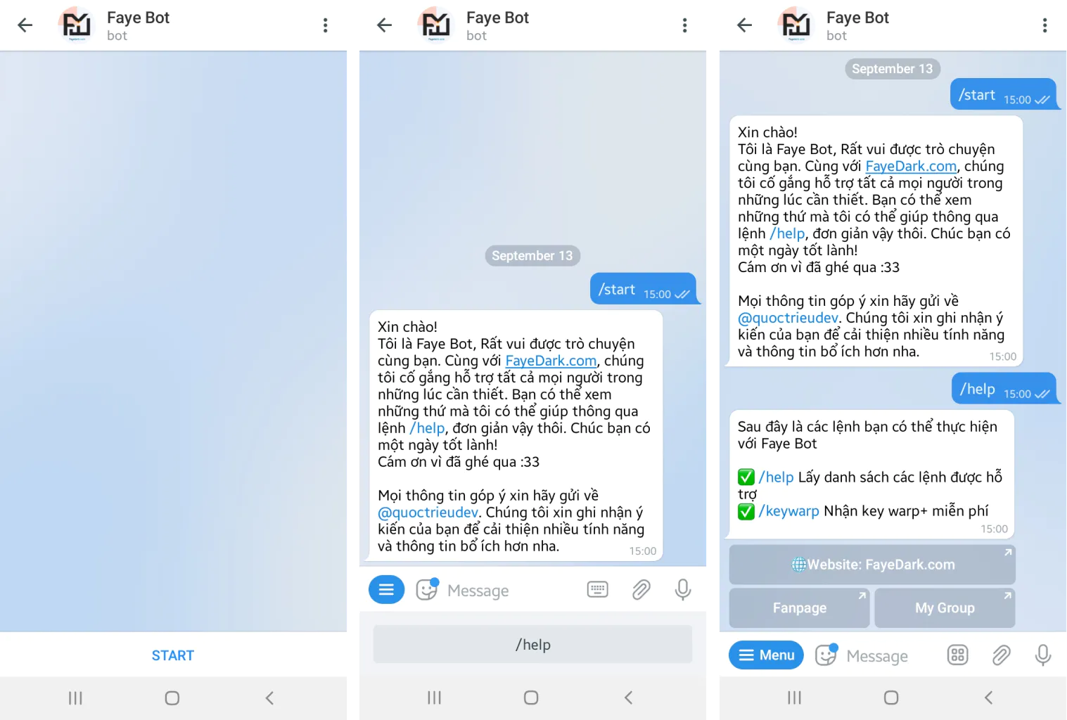 Sau đó thì cửa sổ chat với Faye Bot (@fayedark_bot) hiện ra. Bạn nhấn vào cái nút Start lù lù trên màn hình để bắt đầu. Nếu mà bot rep lại thì Ok nhá. Còn nếu không rep thì chắc nó bị crash ở đâu đó rồi :((, mình sẽ sớm sửa lại thôi :v