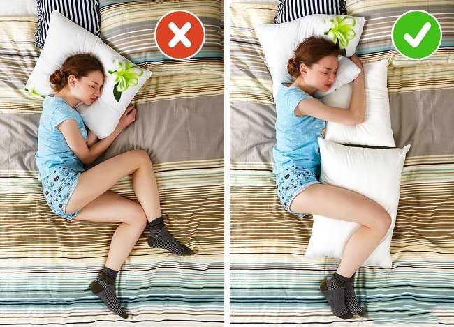 Co người khi ngủ, tư thế này còn được gọi là tư thế bào thai, co cụm tròn người như em bé vì vậy nhiều bạn sẽ thấy thoải mái hơn, nhưng nằm quá lâu dễ bị đau mỏi lưng. Giải pháp cho bạn là sử dụng gối kê xung quanh bụng, giữa 2 khớp gối.