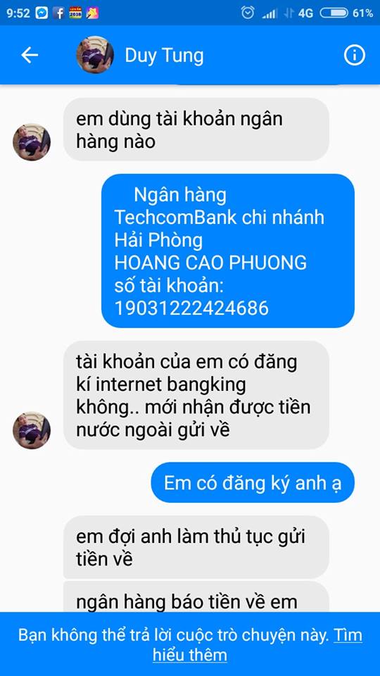 #Vào sáng thứ 2 ngày 9/10/2018 chủ fb PHẠM DUY TUNG nhắn tin cho tôi để giao dịch mua 1 chú chó trị giá 8 triệu đồng Sau đó kẻ lừa đảo gửi tin cho tôi trả giá 7.8 triệu hắn nói mình đang ở Úc mua làm quà tặng, hắn sẽ chuyển tiền qua tài khoản và tôi chuyển chó đi. Tiếp theo hắn gửi cho tôi 1 tin nhắn là đã chuyển 7.8 triệu kèm đường link để vào xác nhận chuyển tiền do đây là tiền từ nước ngoài chuyển về. TÔI ĐÃ KICK VÀO ĐƯỜNG LINK ĐIỀN TÊN MẤT KHẨU , MÃ OTP