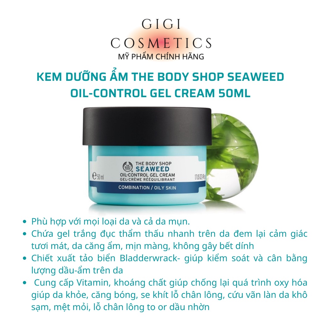 The Body Shop là thương hiệu mỹ phẩm của Anh. The Body Shop Seaweed Oil-Control Gel Cream là sản phẩm có chứa thành phần tự nhiên như: Tảo biển có nguồn gốc từ Iceland, tinh dầu hạt mè và đậu nành… giúp giữ ẩm cho da, kiểm soát chất nhờn, giảm tình trạng mụn đặc biệt là cung cấp thêm thành phần vitamin E dưỡng da và chăm sóc cho da.
