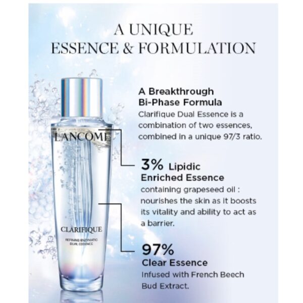 Nước thần dưỡng chất kép Lancôme Clarifique Dual Essence điều trị nổi bật tăng cường với GLYCOLIC ACID, cải thiện rõ rệt kết cấu và tông màu da không đồng đều trong khi giảm thiểu sự xuất hiện của lỗ chân lông. tẩy da chết, dưỡng da mịn màng tươi trẻ.